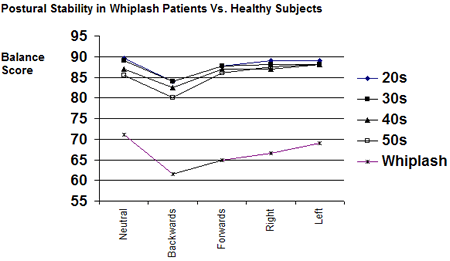 The researched found two interesting pieces of information. First, all of the subjects had more trouble maintaining balance with the head in the backwards position. Secondly, whiplash patients had significantly reduced postural control functioning.