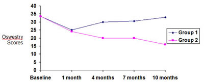 • Disability levels, however, showed a different response. For the patients with no continuing treatment, the disability levels returned to their pretreatment levels on the Oswestry. The Group 2 patients – who received maintenance care – continued to see improvement in disability scores over the whole nine months.